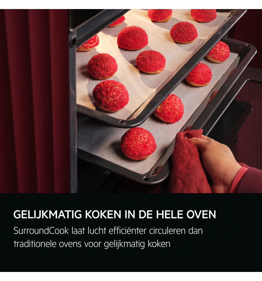 Het slimme hetelucht convectiesysteem zorgt dat de warme lucht gelijkmatig in de ovenruimte circuleert, voor een sneller en energiezuiniger bereidingsproces.