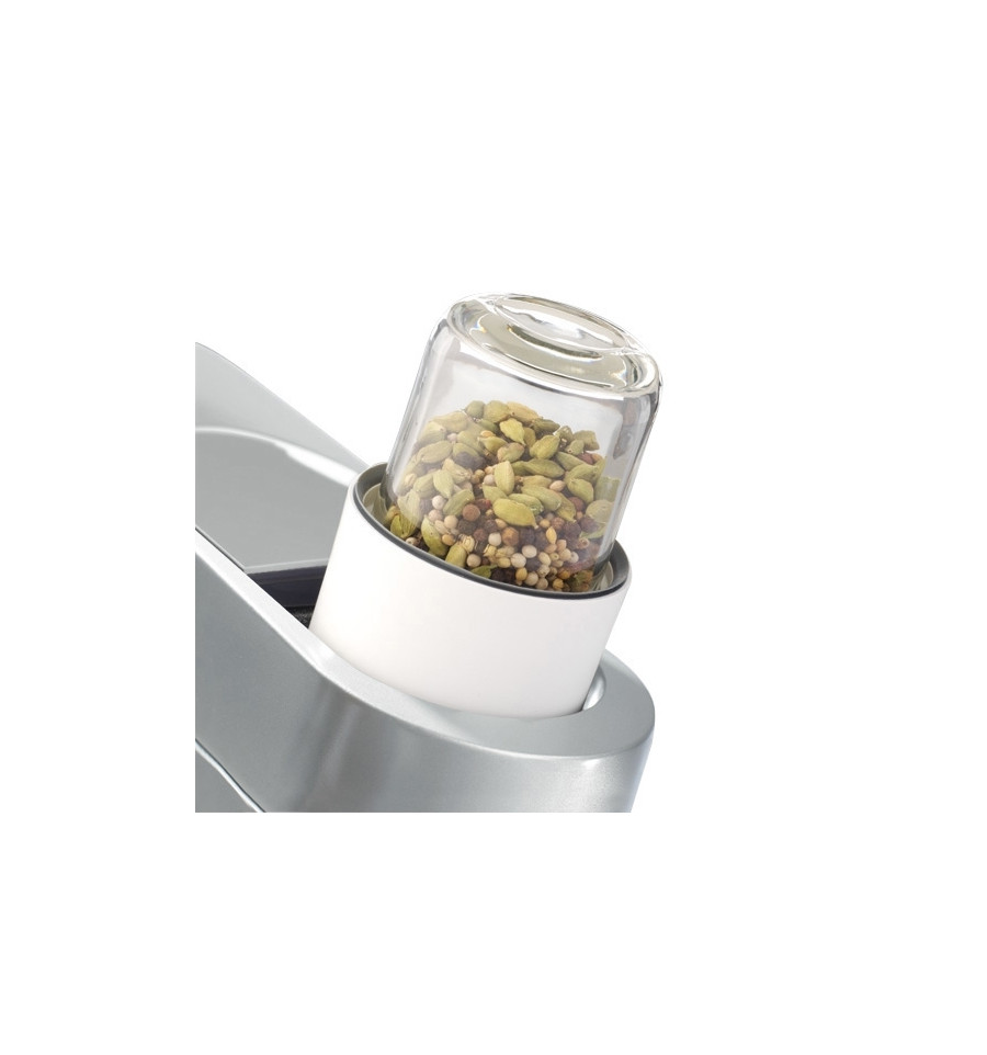 De multimolen is een zeer veelzijdig accessoire dat u allerlei kleine, vaak vervelende of tijdrovende karweitjes uit handen neemt. Dit accessoire kan niet alleen harde ingrediënten zoals specerijen voor u malen, maar dankzij de scherpe mesjes kan deze ook uistekend dienst doen als kleine molen of blender. Erg geschikt voor babyvoeding, kruiden, koffie, marinades, dressings, puree, kruiden en noten. De multimolen wordt geleverd met een set van drie voorraadpotjes met deksel.