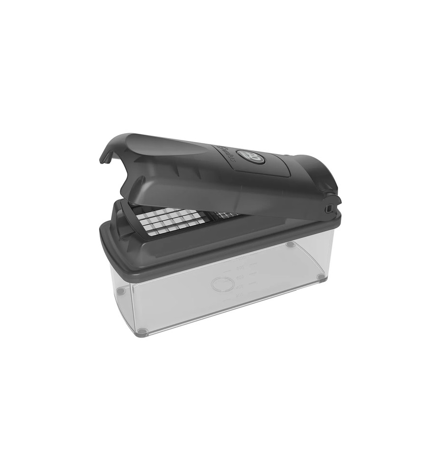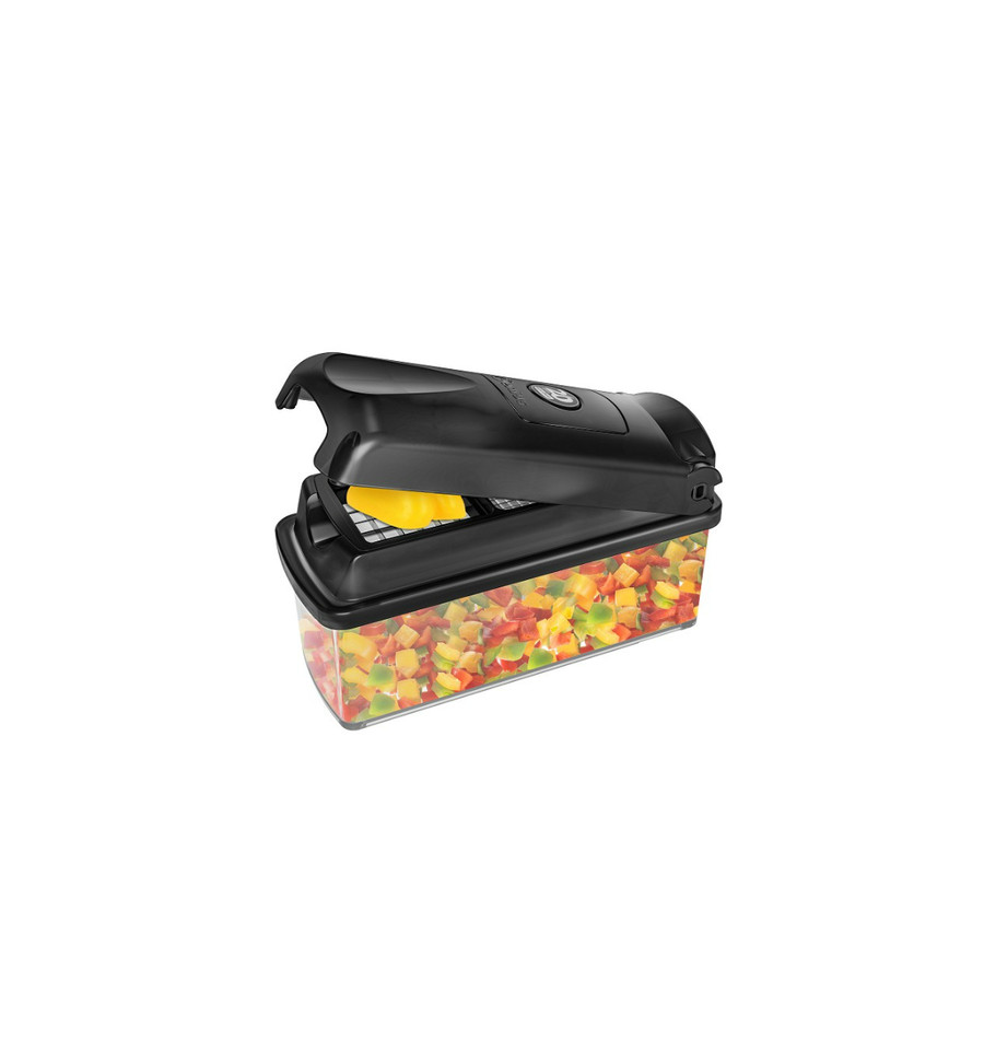 In elegant zwart en inclusief de populaire XXL mesinzetstukken is de Nicer Dicer Plus stijlvoller dan ooit - perfect voor elke keuken.