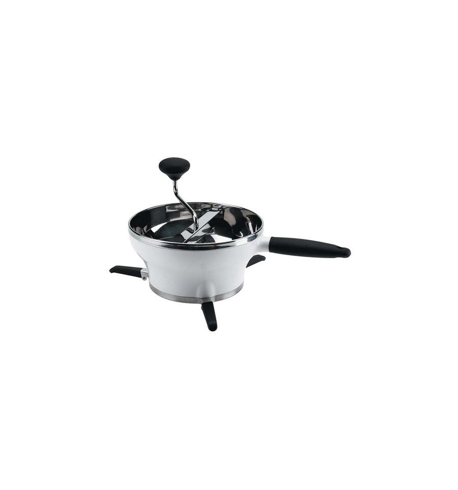 De passe-vite heeft een unieke ontgrendelingsknop die het verwisselen van bladen en het uit elkaar halen ervan bij het opbergen gemakkelijk maakt. Drie antislip poten houden de passe-vite veilig op kommen en potten met een maximale diameter van 11 inch en zorgen ervoor dat haren uit de buurt van uw voedsel blijven. De poten kunnen tevens worden ingeklapt om eenvoudig opbergen mogelijk te maken. Het zachte antislip handvat en de zachte antislip knop zorgen voor comfort bij het oppakken van de passe-vite en bij het draaien van het blad. Alle onderdelen zijn vaatwasmachinebestendig.