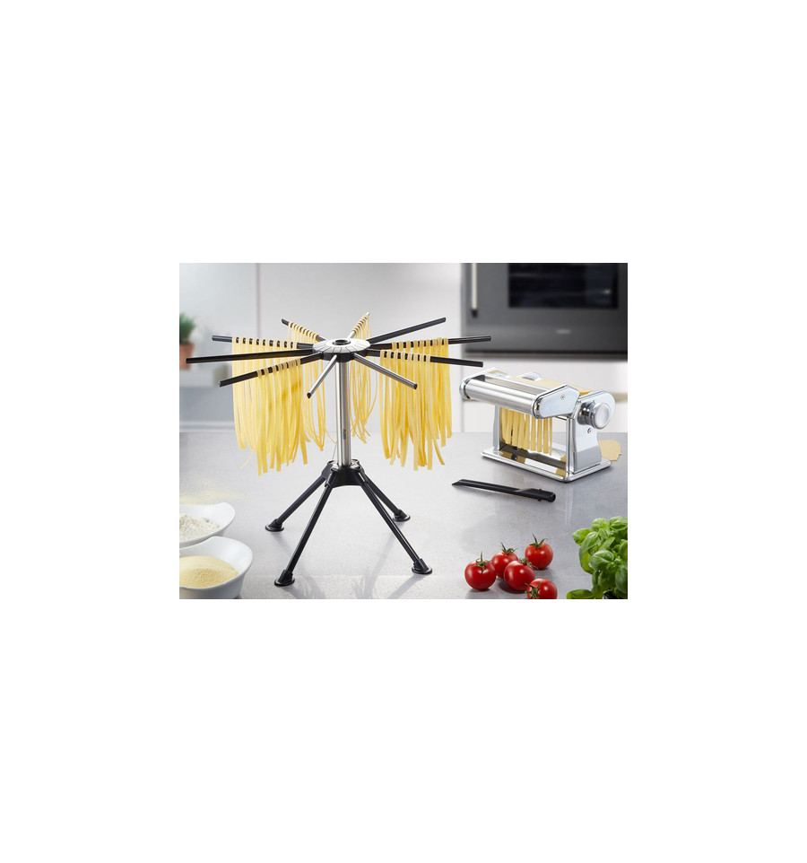 Dit gaat in een handomdraai, omdat de geïntegreerde transferstang de pasta direct uit de pastamachine op de 10 armen van elk 17 cm lang legt.