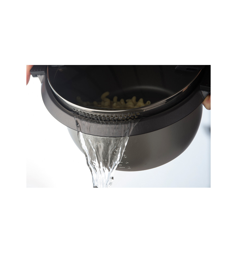 Een extra troef is het glazen deksel met geïntegreerd vergiet voor het makkelijk en veilig weggieten van het hete water.