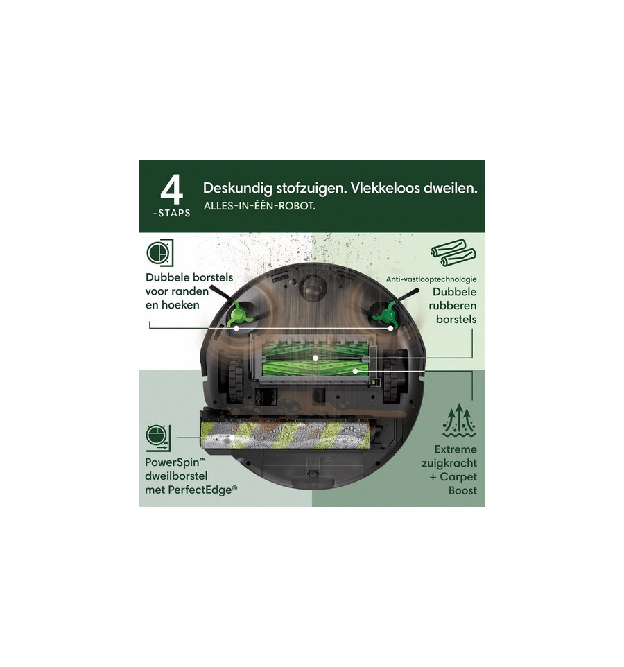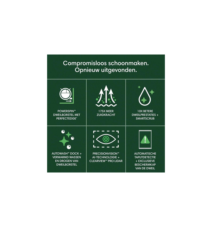 Uitgerust met een zelfreinigende dweilborstel voor nauwkeurig schoonmaken van randen, dubbele rubberen borstels met anti-vastlooptechnologie en een krachtig dock voor volledig handsfree schoonmaken, dag in dag uit.