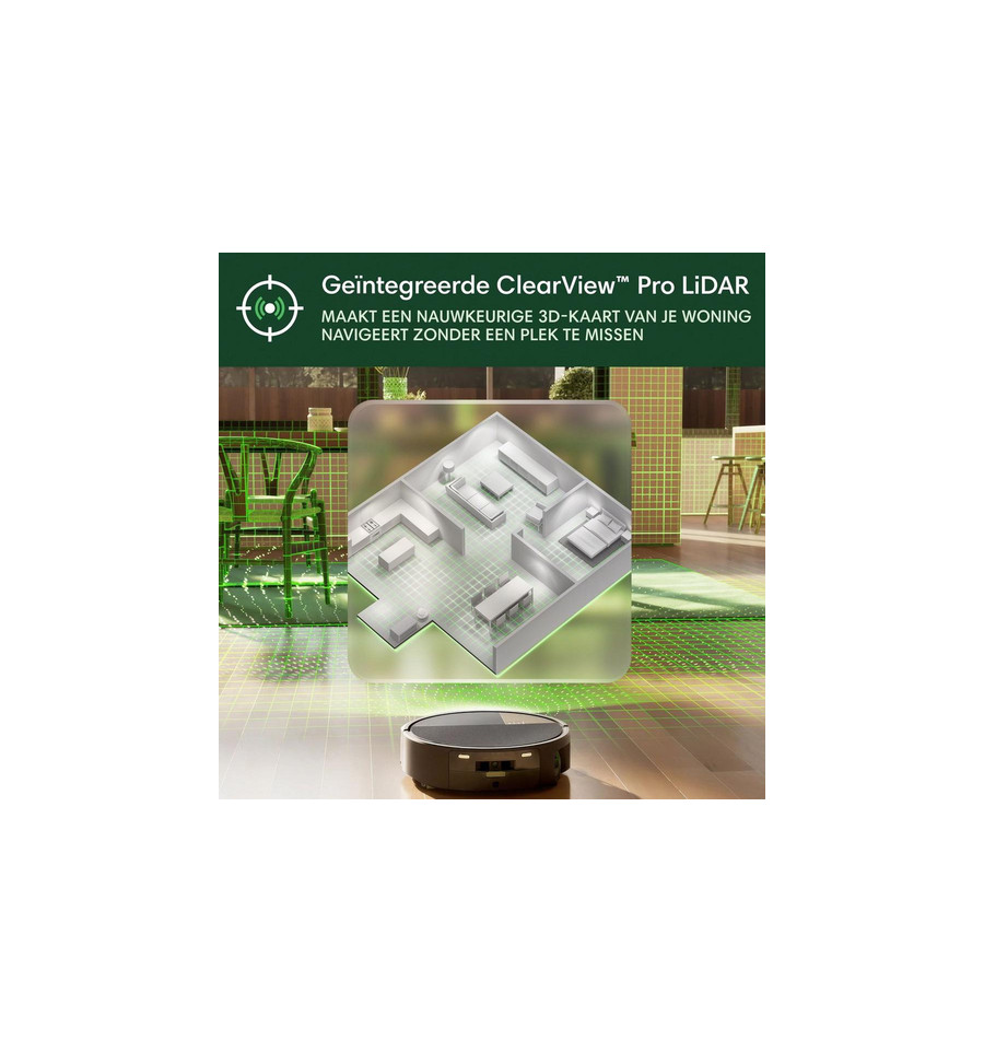 Zit subtiel verborgen in de robot, maakt vakkundig gedetailleerde 3D-kaarten en geeft automatisch namen aan je kamers voor een maximale dekking en grondig schoonmaken, dag en nacht.